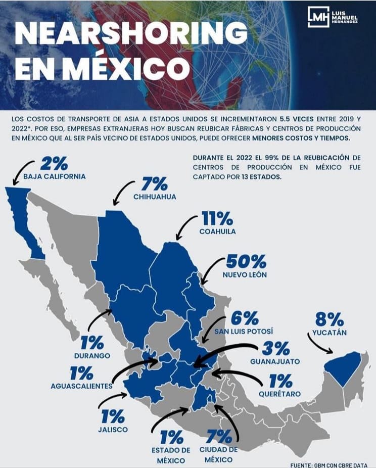 El flete marítimo que va de China a Estados Unidos se ha encarecido cinco veces en los últimos dos años. Es decir, que el valor del 2020 o 2021 hay que multiplicarlo por cinco para tener las cifras actuales. Ante esto, hay empresas que se han mudado a México en un movimiento que se llama “Nearshoring” que busca acercarse a su mercado, a Estados Unidos.