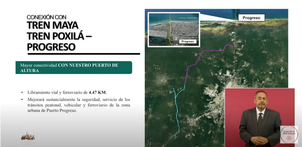 Ante esta pretensión, Vila Dosal explicó que el Tren Maya va a contar con un nuevo ramal que irà desde la sub-estaciòn de Poxilà en Umàn hasta Progreso. «El presidente ya autorizó una ampliación de la estaciòn de Poxilà hacia el Puerto de Progreso y crear en los terrenos donde está la ex zona económica especial un patio de maniobras que nos va permitir que la carga que llega al Puerto de Progreso, aprovechar toda esta infraestructura ferroviaria», agregó el jefe del ejecutivo yucateco.
