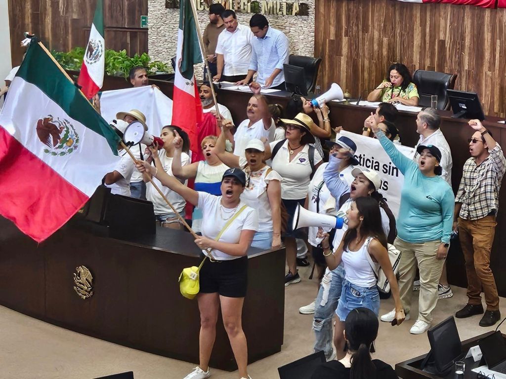 Cuando una de las manifestantes logró pararse en la propia Mesa Directiva con una bandera de México, la presidenta Pat Dzul se apartó de la mesa y siguió con su lectura. En ese momento, el diputado panista Alvaro Cetina Puerto se iba a dirigir a la presidenta pero fue interceptado por el propio Cuevas Mena. No hubo jab, ni upper ni mucho menos los ganchos que sueltan excelsos boxeadores como Saúl “El Canelo” Álvarez, pero el diputado panista acusó una agresión física. “Esto lo estamos viendo, son expresiones de los trabajadores, miembros del Poder Judicial, las cuales Acción Nacional desde luego la respaldan, nosotros no creemos en esta mal llamada Reforma Judicial, nosotros no creemos que vaya a combatir de raíz la falta de justicia y la impunidad, hay que establecer un diálogo muy directo,con todas las voces, coincidimos que la falta de justicia debe ser el meollo del asunto”, dijo la promesa de los blanquiazules. “Hubo una agresión física pero creo que ustedes ya conocen al diputado que mencionas”, agregó Cetina Puerto.