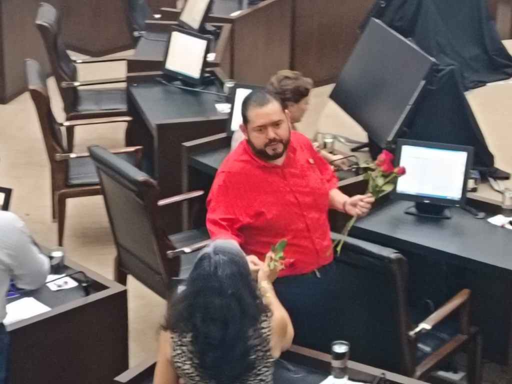 Precisamente, el legislador se presentó con una camisa roja intenso, posiblemente en alusión al 14 de febrero, día del amor y la amistad. Incluso, fue curul por curul y les dejó una rosa a las mujeres diputadas sin distinción de partido.